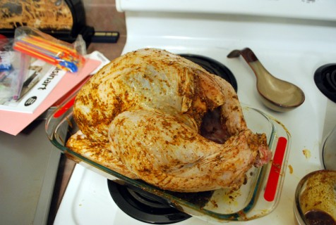 - Using your hands, pull back the skin on the breast meat and near the thighs. Then, rub the turkey with the wet rub all over the skin and underneath the skin in the pockets that you just made. At this time, insert your probe thermometer if you have one, into the thigh. Make sure that it does not touch the bone.